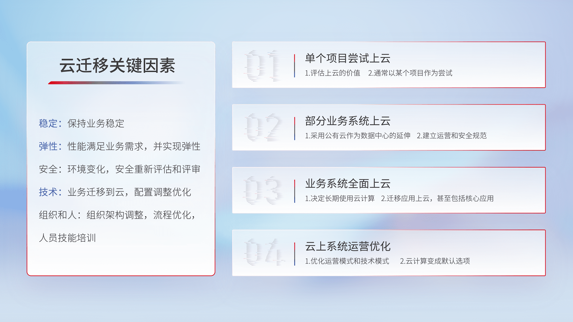 结合实际业务,,,,从规划设计、、、、云平台选型、、、、云原生改造、、数据迁移、、集成交付,,,,迁移全过程为客户识别最佳上云路径,,,,做好风险识别管理,,设计网络架构、、、身份权限、、、安全审计合规、、、操作审计、、、日志审计、、监控告警策略、、、、多站点容灾设计等,,对云上基础设施进行整体规划,,,,提升IT治理水平,,以满足弹性、、高可用、、、、高性能的需求。。