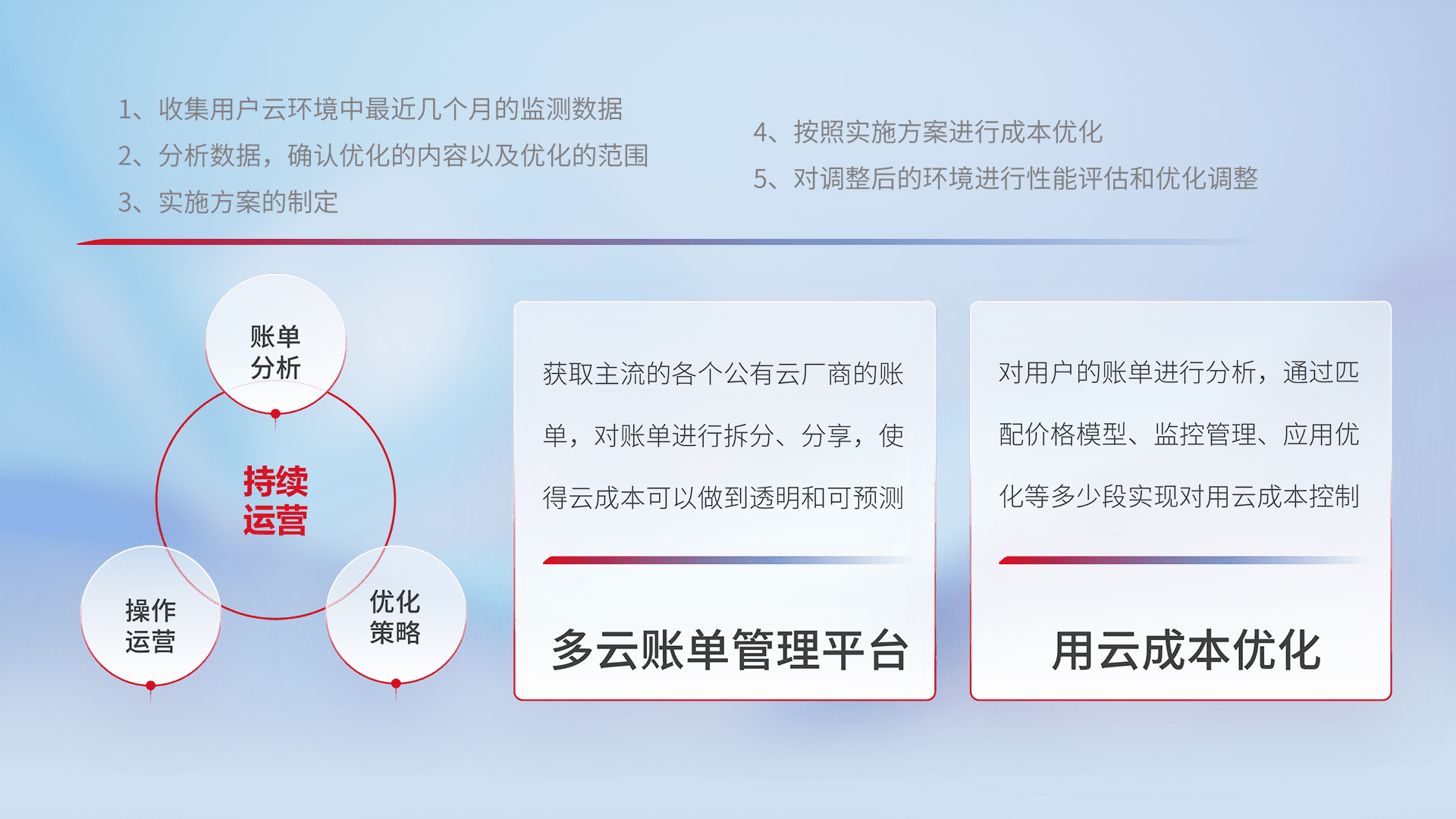 通过多云纳管,,,,以统一的资源数据模型把客户的云资源进行抽象和封装,,,进而实现对多云资源的统一操作,,,保障云资源管理的可靠性、、、稳定性与可用性。。。。量身定制化运维内容,,配置、、、开发运维、、补丁管理、、、、备份、、监控、、认证和访问管理、、、、审计和日常巡检等,,保障在用云过程中的可靠度,,稳定度以及高可用率。。