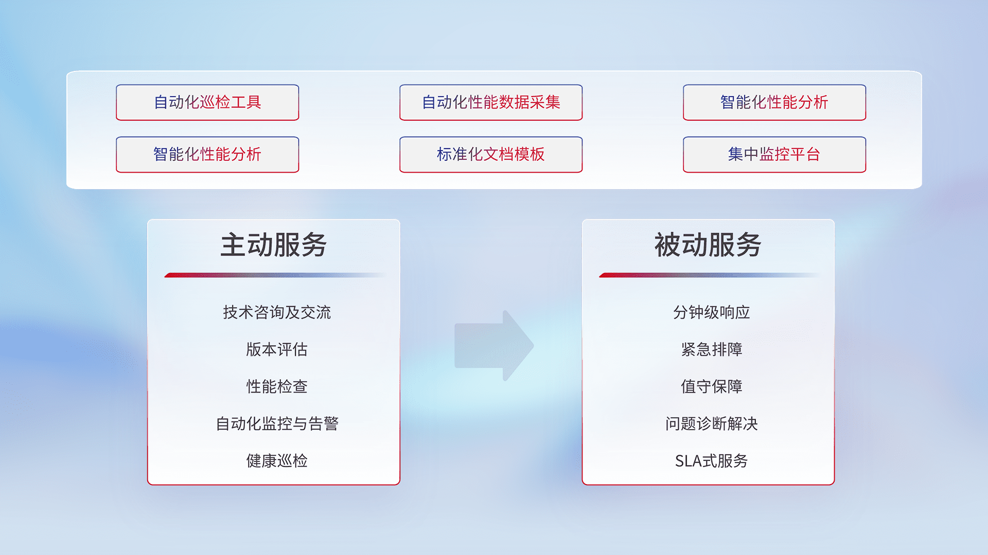 智能化工具和标准化文档,,,保障服务质量,,提供主动服务(包含技术咨询、、、、版本评估、、、性能检查、、、自动化监控与告警、、、、健康巡检)和被动服务包含(分钟级响应、、、紧急排障、、、值守保障、、问题诊断解决、、、SLA服务)。。